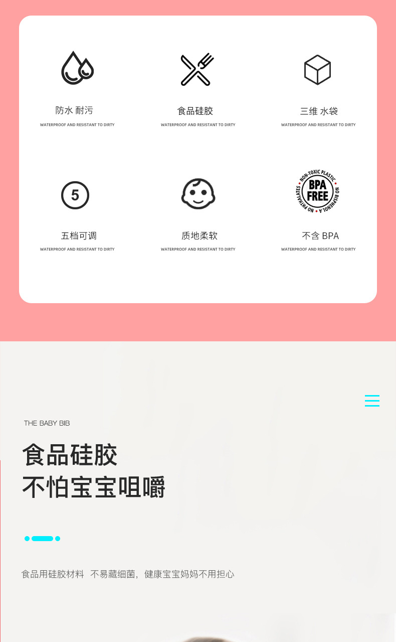 嬰幼兒唾液分泌一直以來(lái)每個(gè)家庭中都沒有得到很好的解決方法,嬰兒從出生知道一歲多這個(gè)時(shí)間段里面張嘴口腔動(dòng)作屬于萌芽期,所以流口水也不是它們的錯(cuò),吃飯灑漏更不是他們的錯(cuò),所以寶媽們洗衣服也是沒理由的,而目前只能選擇以預(yù)防為主,而硅膠圍嘴兜目前是主要的嬰幼兒防護(hù)用具,所以看準(zhǔn)這幾個(gè)因素選對(duì)圍兜可輕松很多。