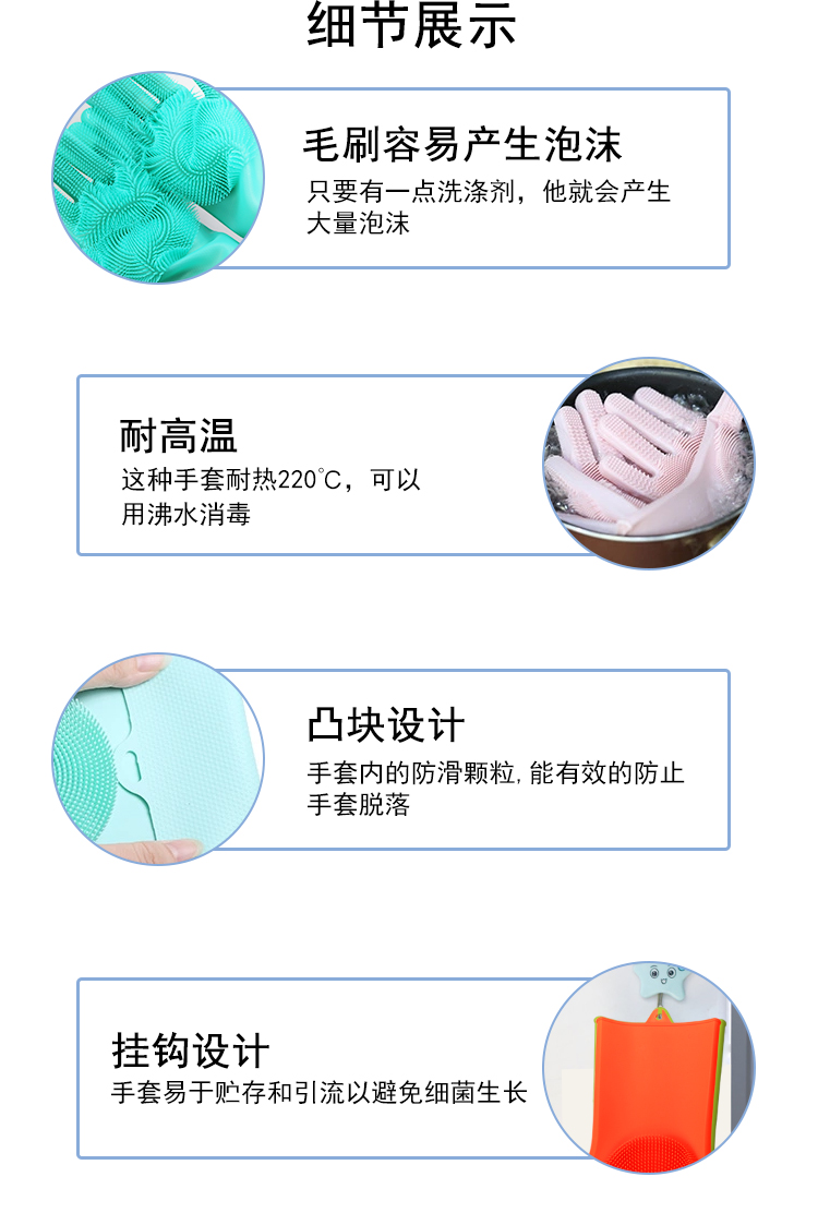 硅膠清潔手套是近年來比較火熱的廚房清潔用品。采用柔軟硅膠健康材質,手套正面有多重清潔刷頭,耐磨耐熱,強力去除污漬。