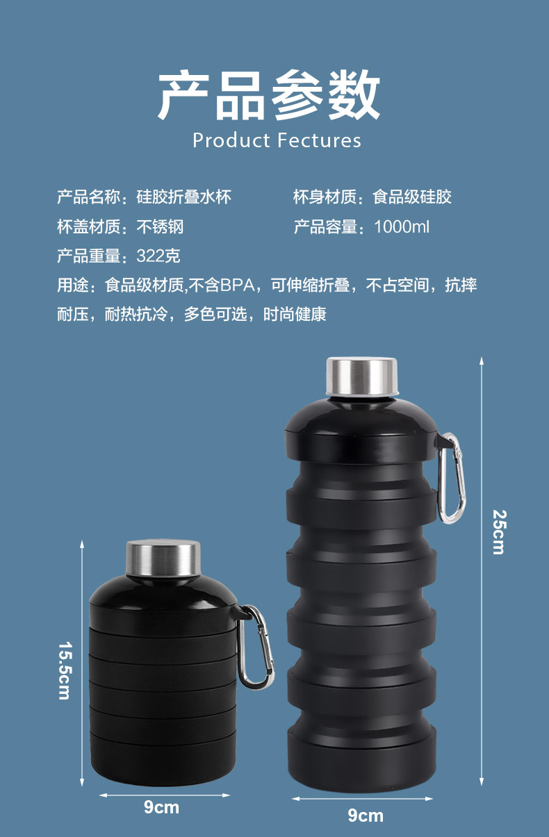 用途:食品級材質,不含BPA,可伸縮折疊,不占空間,抗摔耐壓,耐熱抗冷,多色可選,時尚健康
